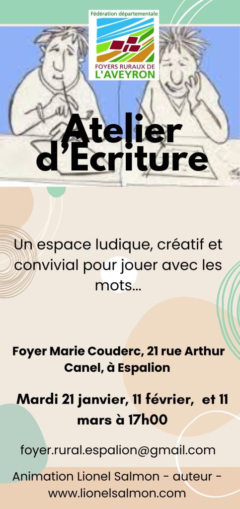 ATELIER D’ÉCRITURE LUDIQUE ET CRÉATIVE Foyer Rural d’Espalion Partager: Email a link to a friend(ouvre dans une nouvelle fenêtre) E-mail Partager sur Facebook(ouvre dans une nouvelle fenêtre) Facebook J’aime chargement…